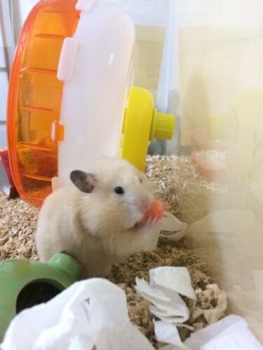 今日のみそあんは8時頃就寝、18時半に起きてきたのでお掃除しました。今日は夕飯にミニキャロットを食べたので、小さいものをみそあんにもプレゼント。 すると頬袋に丸ごと詰め込もうとするみそあん…。 途中で無理だと悟り、ホイールの後ろでもぐもぐ食べて…